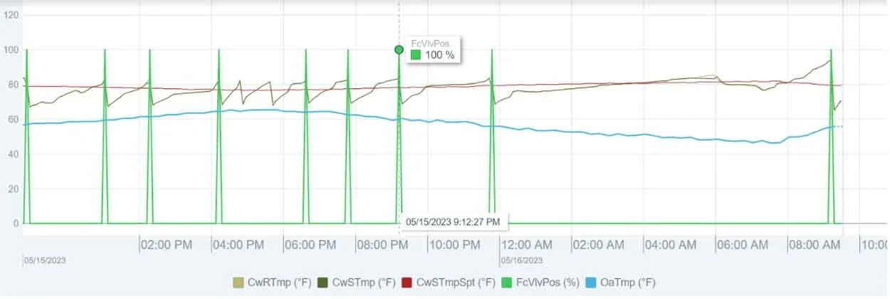 Fluid cooler valve (Green) opening whenever CW supply temp (Dark Green) exceeds CW loop setpoint (Red) by 5F cool mode offset indicating fluid cooler loop enabled for heat rejection. Then, as the fluid cooler rejects heat from the CW loop, the CW supply temp quickly drops 5F below the 5F CW loop heat mode offset, which then disables the fluid cooler and enables the boiler to heat the CW loop back up to setpoint.